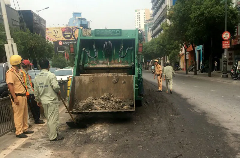Do đó, Đội CSGT Tân Sơn Nhất đã cử lực lượng giải quyết và liên hệ với Công ty Vệ sinh môi trường quận Phú Nhuận đến hỗ trợ thu gom, dọn dẹp số đất trên. Trong vòng hai giờ đồng hồ, lượng đất rơi vãi được giải quyết và trả lại mặt đường thông thoáng cho xe cộ di chuyển.