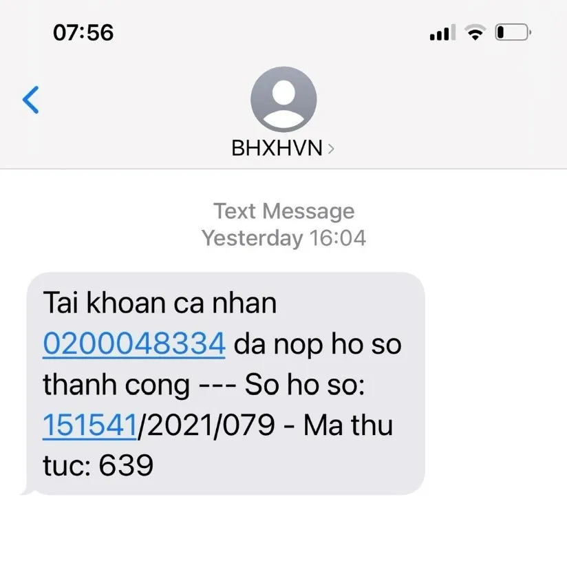 Bước 7: BHXH Việt Nam gửi tin nhắn đến điện thoại người dùng thông báo tài khoản cá nhận đã nộp hồ sơ thành công.
