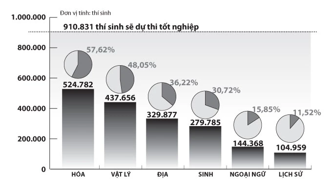 Với môn lịch sử, tình hình hoàn toàn ngược lại. Tại Hà Nội và TP.HCM, số học sinh chọn thi môn này đứng cuối bảng (Hà Nội: 6.753 và TP.HCM: 3.941).