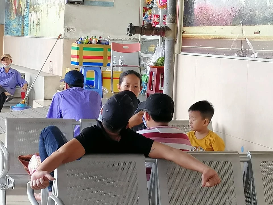 Có những hành khách ngồi chờ xe và không đeo khẩu trang hoặc đeo không đúng cách (kéo xuống cằm)
