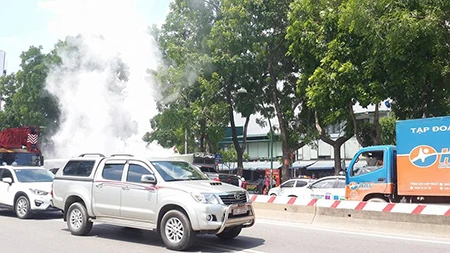 Khói bốc ra từ chiếc xe ngùn ngụt.