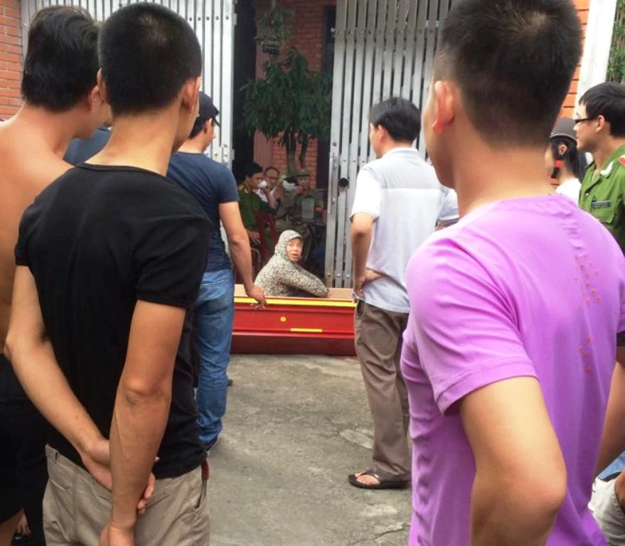 Xoan ngồi trong quan tài khi mang quan tài đi đòi 800 triệu tiền bị lừa chạy án cho chồng vào tháng 9-2014.