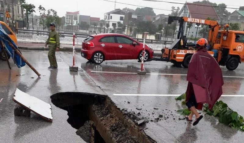 Tại điểm giao nhau đường Lê Viết Thuật và Nguyễn Sỹ Sách xuất hiện sụt lún, hình thành "hố tử thần”. Công an TP Vinh đã phải cử lực lượng ra phân luồng, tránh xe lao xuống hố.