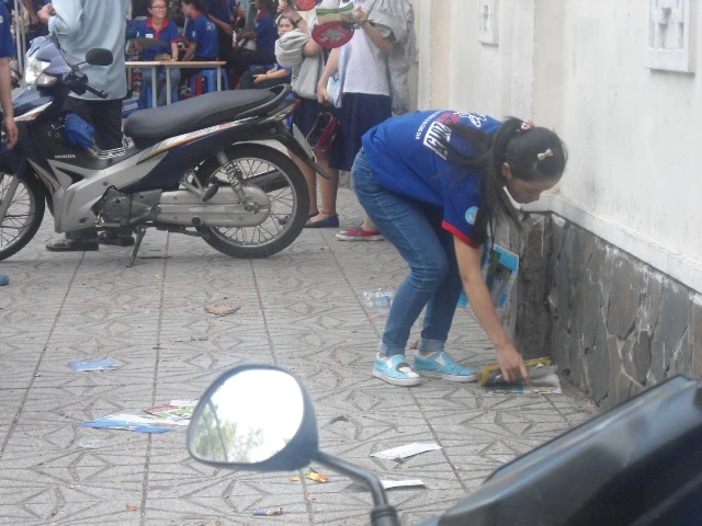 Ngồi đợi con tại ghế đá, chú Nguyễn Văn Thành (Đồng Nai) ngao ngán: “Chiều giờ nhận hơn 20 chục cái tờ kiểu như vậy rồi, xả rác chứ được gì, ban đầu còn thú vị cầm chơi chứ giờ ai đưa cũng không lấy, chỉ tổ mang rác về nhà”.