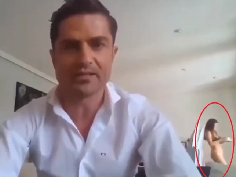 "Bạn gái mới" của ông M. xuất hiện trên khung hình khi ông trả lời phỏng vấn trực tuyến. Ảnh: RT/YOUTUBE