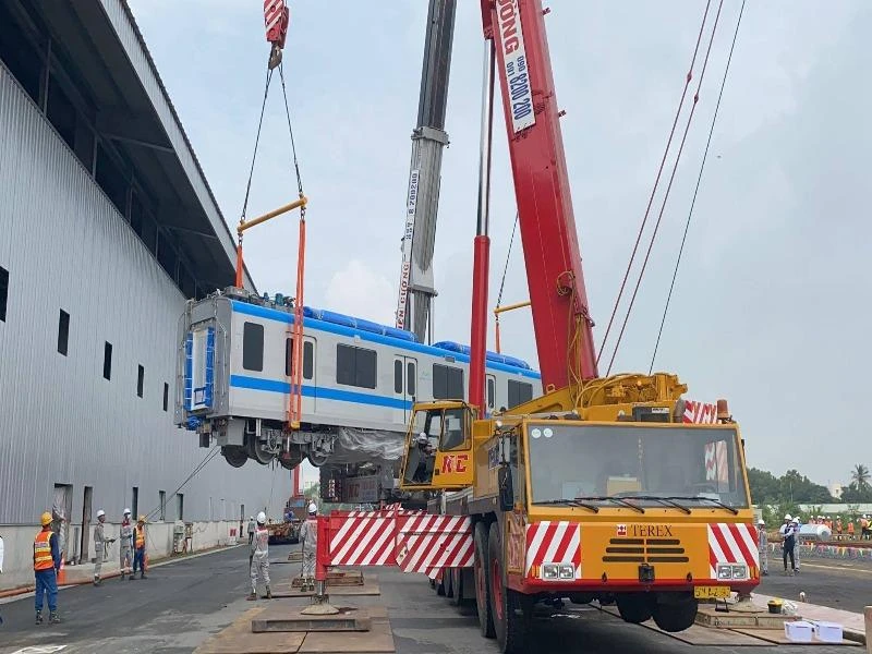 Tàu metro số 1 đang được cẩu khỏi xe siêu trường, siêu trọng.