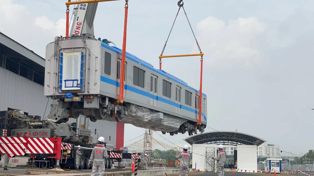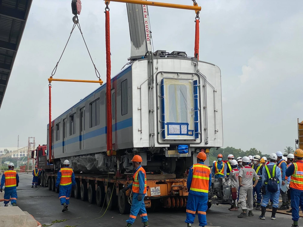 Tàu metro số 1 đang được đưa lên depot.