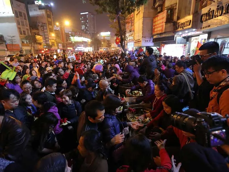 Một buổi phát lộc sau lễ cúng sao giải hạn trên đường dưới chân cầu vượt Ngã Tư Sở, Hà Nội. Ảnh: GT