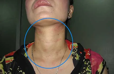 Một bệnh nhân sau khi sử dụng mỹ phẩm đã phải đến BV Da liễu vì những vết nổi mẩn trên cổ. Ảnh: BS