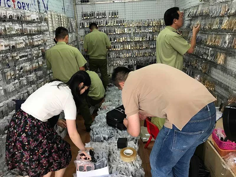 Bộ Công Thương cho rằng có tình trạng hàng hóa đội lốt hàng hóa của Việt Nam nhưng không chỉ xuất khẩu sang nước thứ ba mà còn tiêu thụ ngay tại thị trường trong nước. Trong ảnh: Cục Quản lý thị trường Hà Nội vừa kiểm tra, thu giữ hàng ngàn sản phẩm giả mạo, gian lận thương mại… Ảnh: BCT
