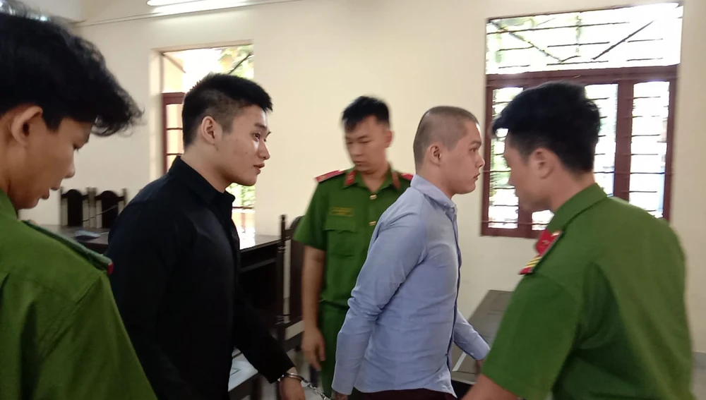 Nguyễn Tấn Hậu và Trần Đỗ Thanh Duy (áo đen) được áp giải ra xe về nơi giam giữ. Ảnh: H.ANH