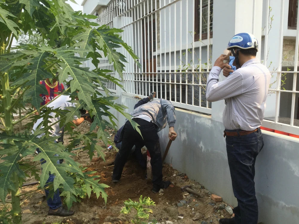 Cơ quan chức năng đang tiến hành nhổ cột mốc cắm bên cạnh nhà dân. Ảnh: NGUYỄN HIỀN