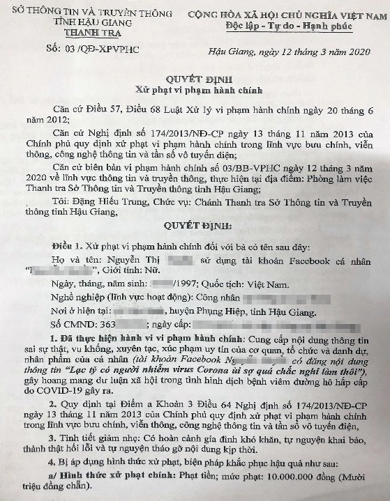 Ngày 12-3, thông tin từ Sở Thông tin và Truyền thông (TT&TT) Hậu Giang, Thanh tra sở này vừa ban hành quyết định xử phạt vi phạm hành chính 10 triệu đồng một cô gái đăng sai thông tin về COVID-19 trên mạng xã hội.