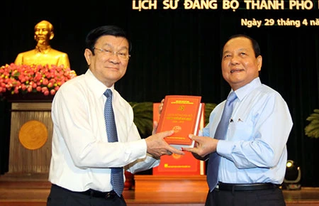 Bí thư Thành ủy TP.HCM Lê Thanh Hải trao tặng Chủ tịch nước Trương Tấn Sang cuốn sách Lịch sử Đảng bộ TP.HCM 1930-1975. Ảnh: T.VŨ