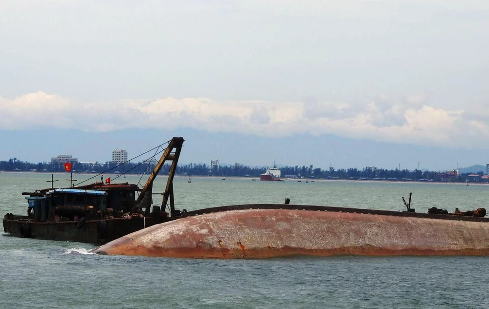 Trục vớt tàu VTB26 đang lật úp trên biển Nghệ An.