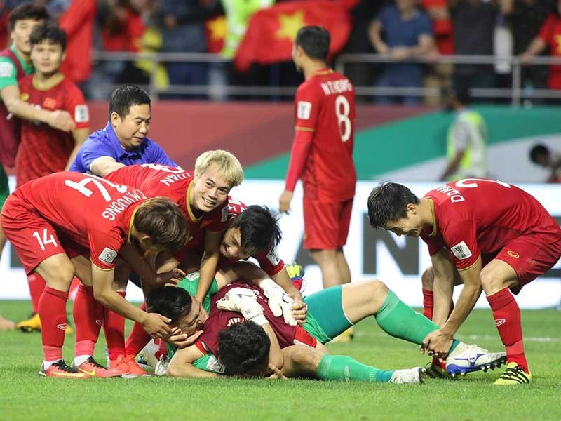 Các đồng đội chúc mừng Lâm sau chiến thắng ở loạt luân lưu trước Jordan. Ảnh: ANH HỮU