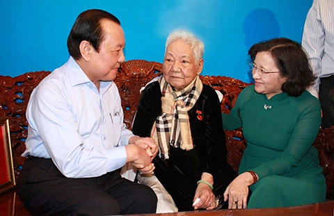 Bí thư Thành ủy TP.HCM Lê Thanh Hải thăm hỏi bà Lê Thị Bạch. Ảnh: TÁ LÂM