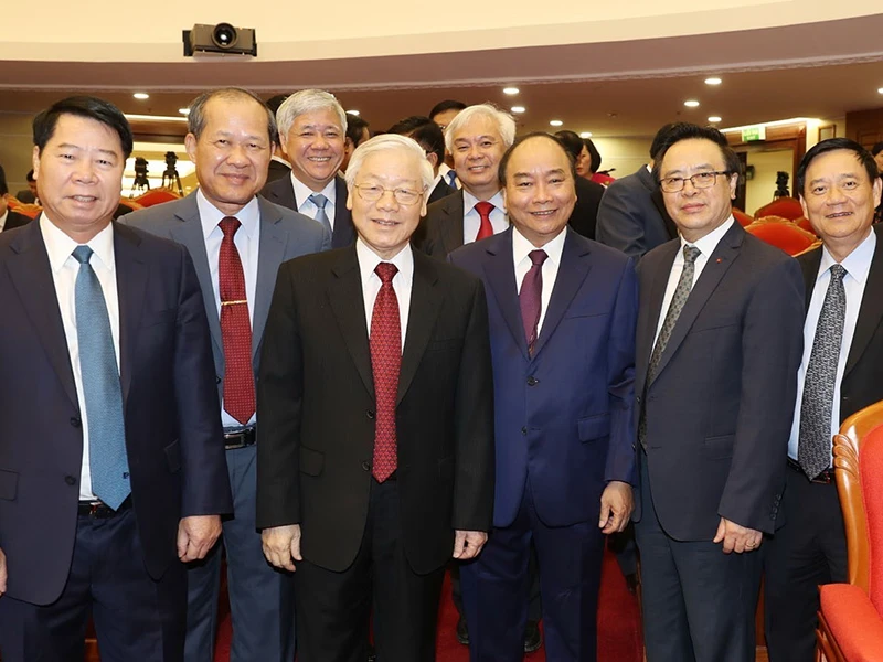 Tổng Bí thư Nguyễn Phú Trọng, Thủ tướng Nguyễn Xuân Phúc với các đại biểu dự Hội nghị Trung ương 8, khóa XII. Ảnh: TTXVN