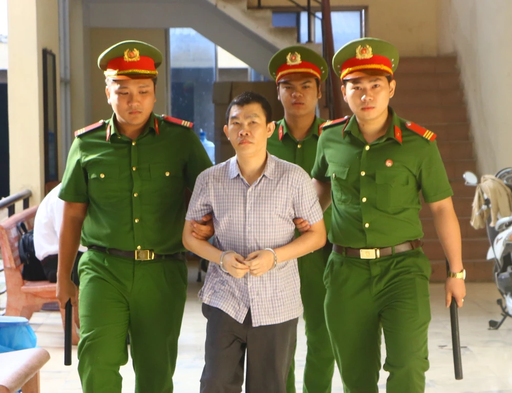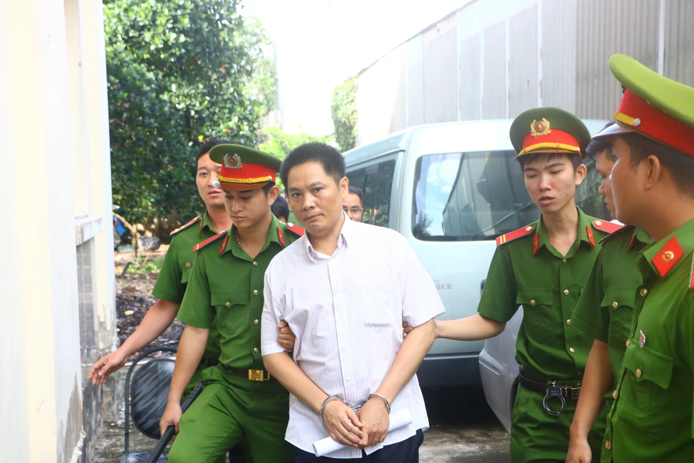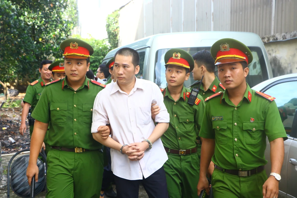 Các bị cáo lần lượt được lực lượng công an đưa đến phiên tòa. Bị cáo Nguyễn Hồng Khanh là người được đưa đến cuối cùng (một bị cáo được tại ngoại).