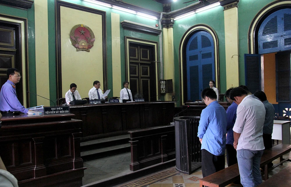 Bị cáo Phạm Sỹ Hoài Như (áo trắng)và các bị cáo tại phiên tòa sáng 23-9. Ảnh: HOÀNG GIANG