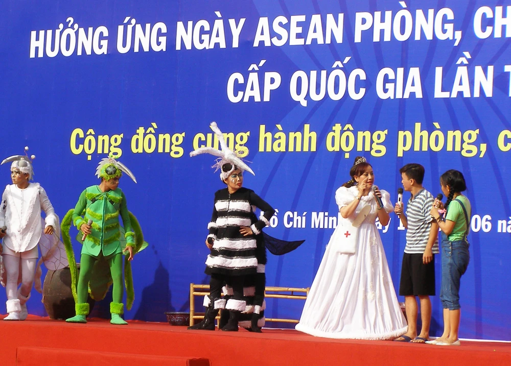 Hoạt cảnh “Kẻ thù tí hon” với thông điệp chung tay phòng, chống sốt xuất huyết được biểu diễn trong lễ mít tinh. Ảnh: TRẦN NGỌC