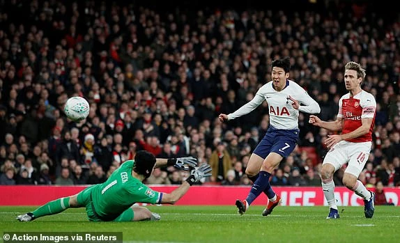 Tấn công liên tục , nhưng Tottenham là đội có được bàn thắng vươn lên dẫn trước. Phút 20, sau đường phát bóng lên của thủ môn bên phía Tottenham, bóng đến chân Dele Alli, tiền vệ người Anh tạt sang cánh phải cho Son Heung-Min. Cầu thủ người Hàn Quốc dễ dàng thoát xuống đối diện thủ môn Petr Cech rồi dứt điểm mở tỉ số 1-0 cho Tottenham.