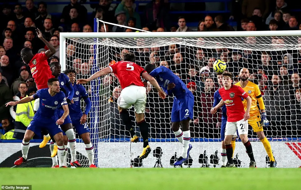 Trung vệ Zouma (15) dứt điểm giữa "rừng" cầu thủ M.U nhưng bàn thắng không được công nhận do trước đó Azpilicueta đã đẩy ngã cầu thủ của M.U.