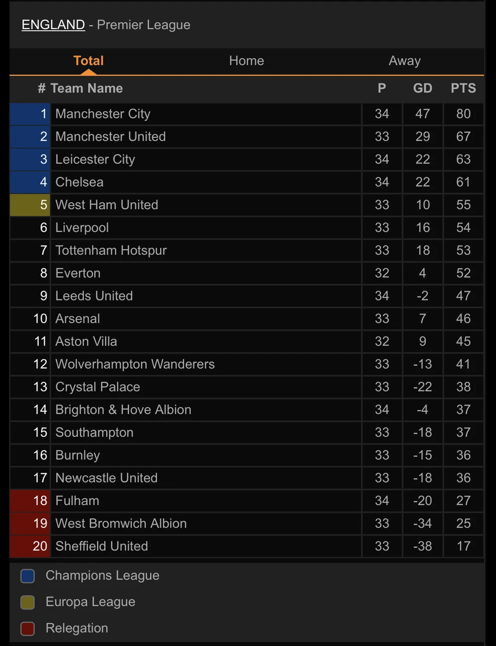 Ở cùng vòng đấu, Man. City có chiến thắng trên sân của Crystal Palace với tỷ số 2-0, với hai bàn thắng được ghi do công của Aguero và Ferran Torres. Chiến thắng này giúp Man. City tiến sát đến ngôi vô địch khi có được vị trí đầu bảng với 80 điểm.