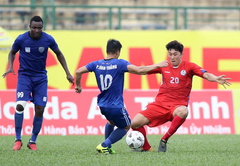 Đinh Thanh Bình có pha đi bóng khiến trung vệ Vasco Da Gama phạm lỗi dẫn đến phạt đền.