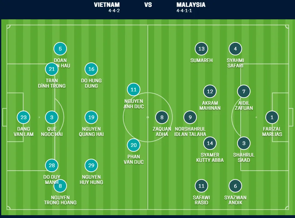 Trong khi đó, đội tuyển Malaysia có sự phục vụ trở lại của ba trụ cột gồm Syahmi Safari hết hạn treo giò và hậu vệ Aidil Zafuan vừa bình phục chấn thương. Điều này giúp các “con hổ” Malaysia như mọc thêm cánh.