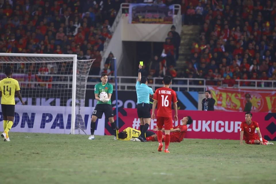 Phút 18, Trọng Hoàng nhận thẻ vàng sau pha ngăn cản đường lên bóng của Malaysia.