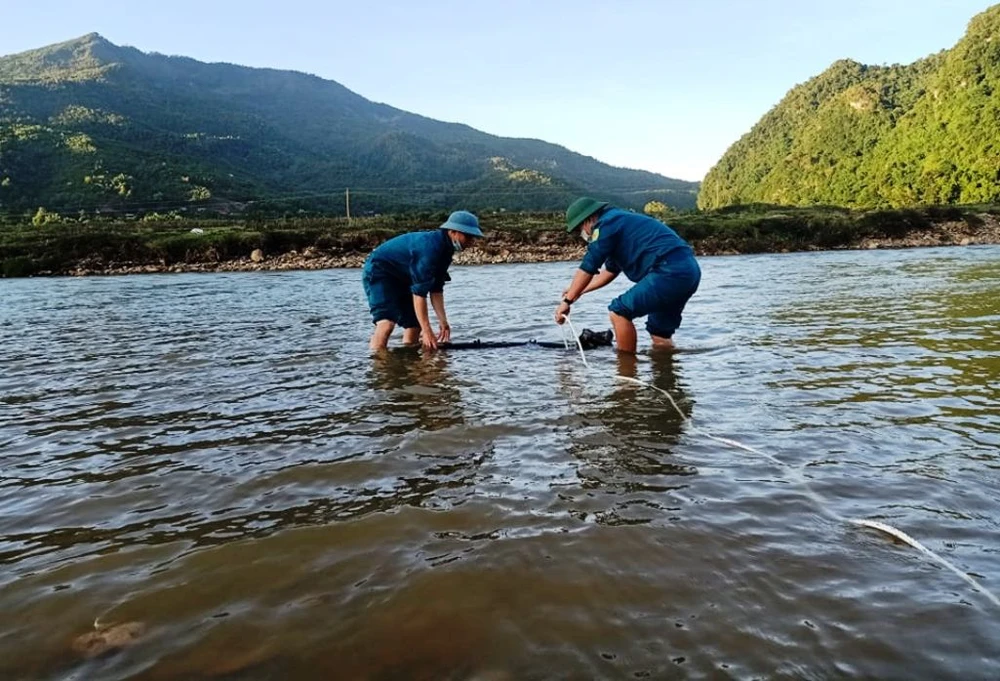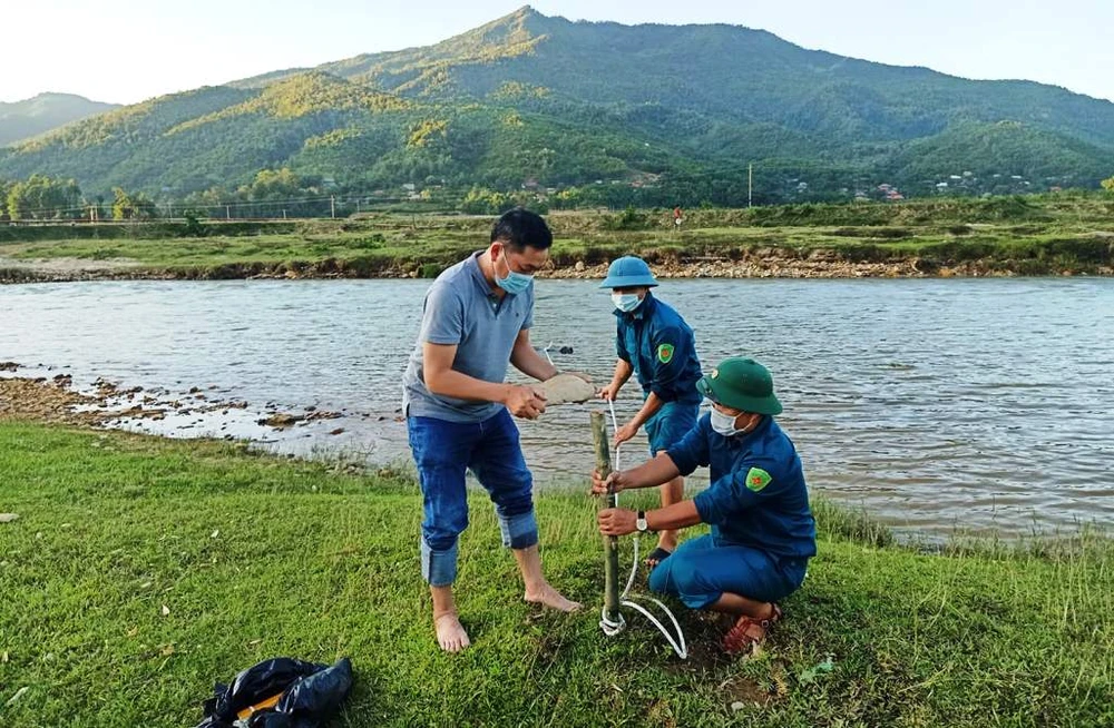 Ngày 20-6, lực lượng chức năng xã Quang Phong (huyện miền núi Quế Phong, Nghệ An) đang bảo vệ nghiêm ngặt quả bom được phát hiện trên sông Quàng.
