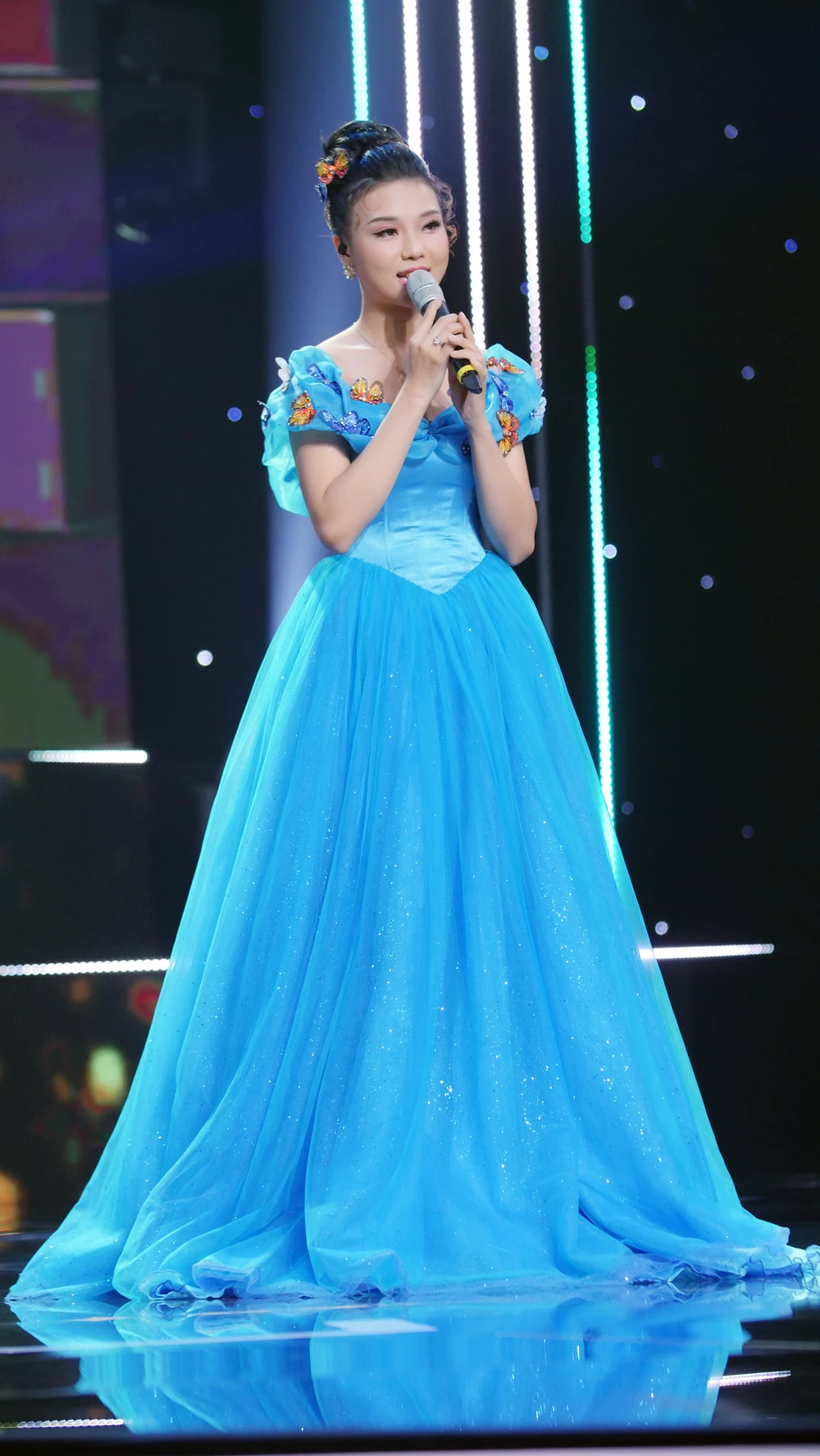 Với ca khúc Tình tự mùa xuân, Thái Bảo mang đến hình ảnh một nàng công chúa xinh đẹp trong bộ váy xanh bồng bềnh.
