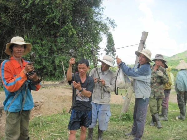 Nói rồi ông Bình và những người đi cùng nhổm dậy, dùng 2 tay bám chặt vào sợi cáp, lấy hết sức bình sinh kéo từng nhịp tay, khó nhọc như bác thợ điện kéo dây để đưa chiếc lồng nhích dần vào bờ. Đến nơi, toàn thân ông phó thôn ướt sũng mồ hôi, mặt đỏ bừng, thở hổn hển. Đợi ông Bình hồi sức, tôi thắc mắc sao đang “bay” mà chiếc lồng khựng lại, ông chậm rãi nói: “Do lúc thiết kế, độ dốc của cột và dây cáp không đều, khi đu với trọng lượng quá lớn thì dây cáp võng xuống, khiến bánh xe không chạy được”.