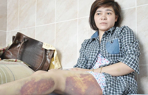 Những vết sưng bầm trên chân chị Thu. Ảnh: TÙNG SƠN