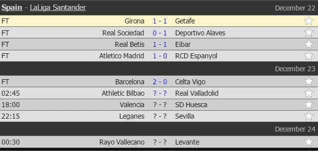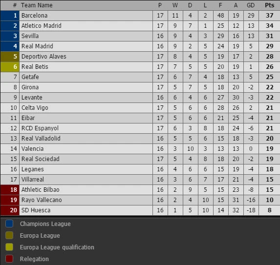 Thắng trận nhẹ nhàng 2-0 trước Celta Vigo trên sân nhà Nou Camp, Barcelona tiếp tục củng cố ngôi đầu bảng với 37 điểm trong bối cảnh mà đại kình địch Real Madrid đang vươn lên mạnh mẽ phải nghỉ thi đấu vòng này vì bận đá FIFA Club World Cup.