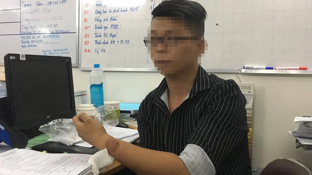 Nam bảo vệ tên Cường bị cắn vào tay, phải đi điều trị phơi nhiễm viêm gan B. Ảnh NT.