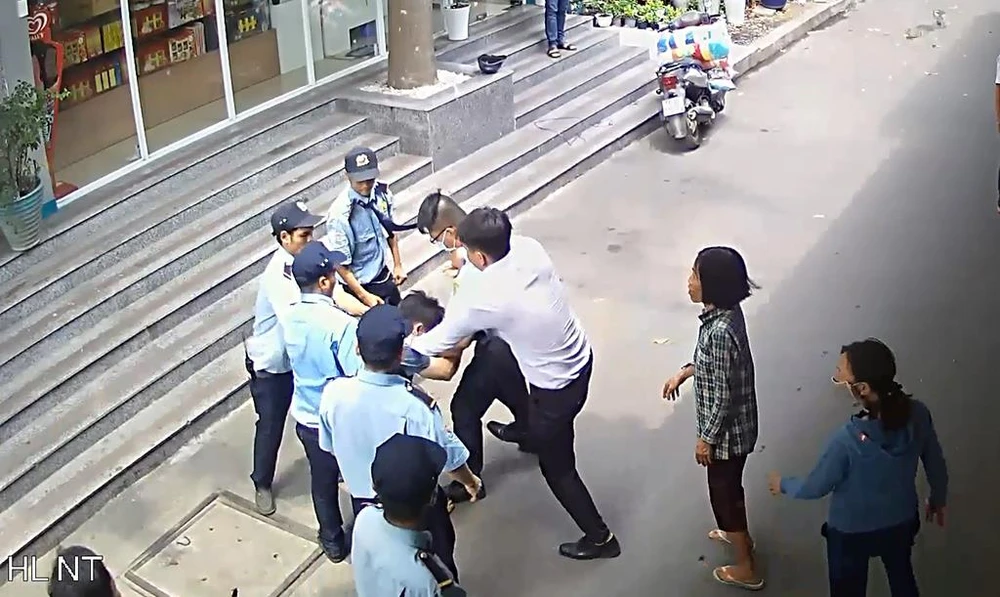 Con trai ông Hưng thấy bố bị đánh chảy máu nên xông vào tấn công bảo vệ. Ảnh cắt từ clip.