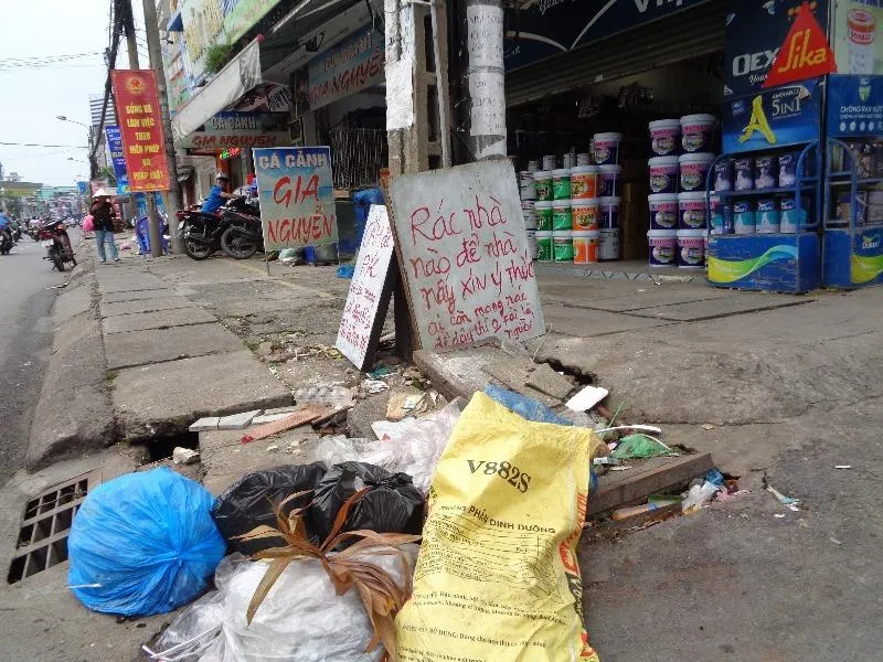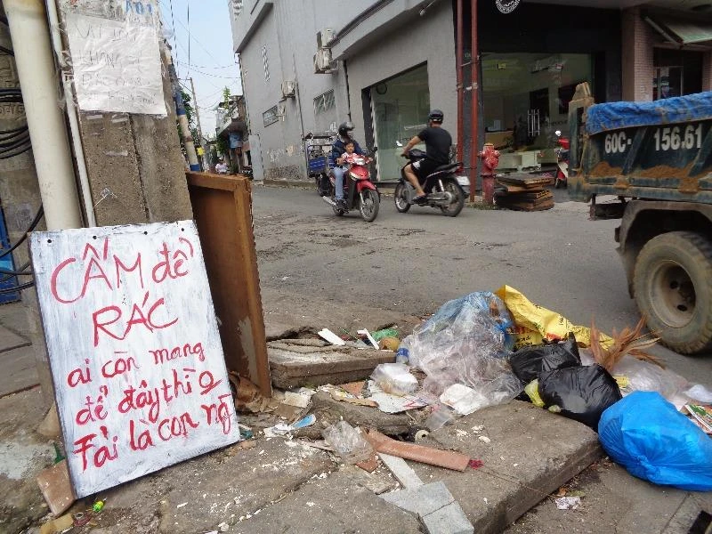 Nhưng dù có bảng cấm vẫn đổ nên người ta đành phải đặt tiếp hai tấm bảng này ở dưới đất: "Rác nhà nào để nhà nấy, xin ý thức"; "Cấm để rác. Ai còn để đây thìkhông phải là con người". Nội dung các bảng cấm do người dân tự đặt nghe có phần nặng nề nhưng thật khó có thể chấp nhận hành vi vứt rác thiếu ý thức thế này.