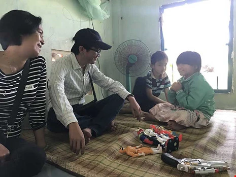 Mọi người đang tính toán chuyện xây nhà cho mẹ con Ngọc Hâng (ảnh trên). Cô giáo cũ của Hâng, nhà báo Đức Hiển cùng hai bé con của Hâng. Ảnh: MINH NAM