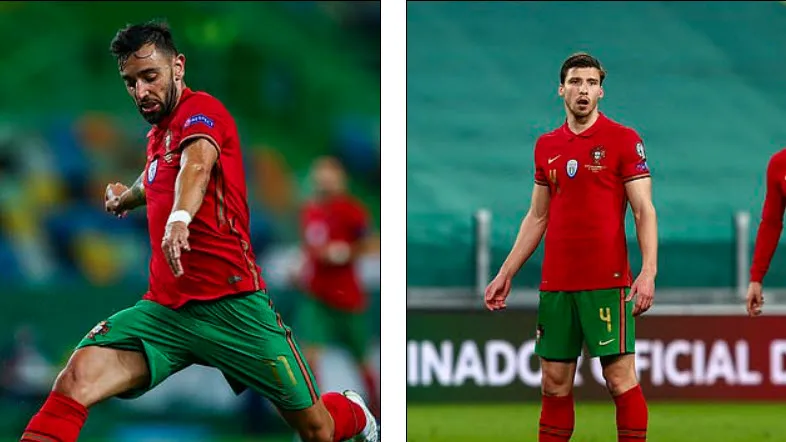 Bruno Fernandes và Ruben Dias trong màu áo Bồ Đào Nha. ẢNH: GETTY
