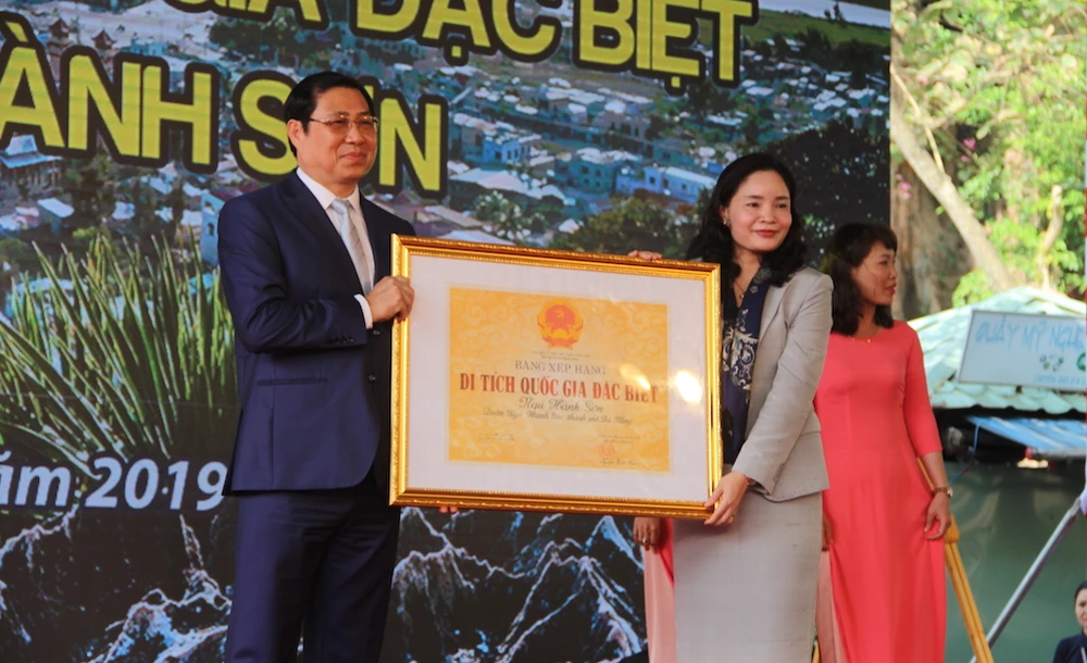 Bà Trịnh Thị Thủy (Thứ trưởng Bộ Văn hoá, Thể thao và Du lịch) đã trao Bằng xếp hạng Di tích Quốc gia đặc biệt Di tích danh thắng Ngũ Hành Sơn cho TP Đà Nẵng.