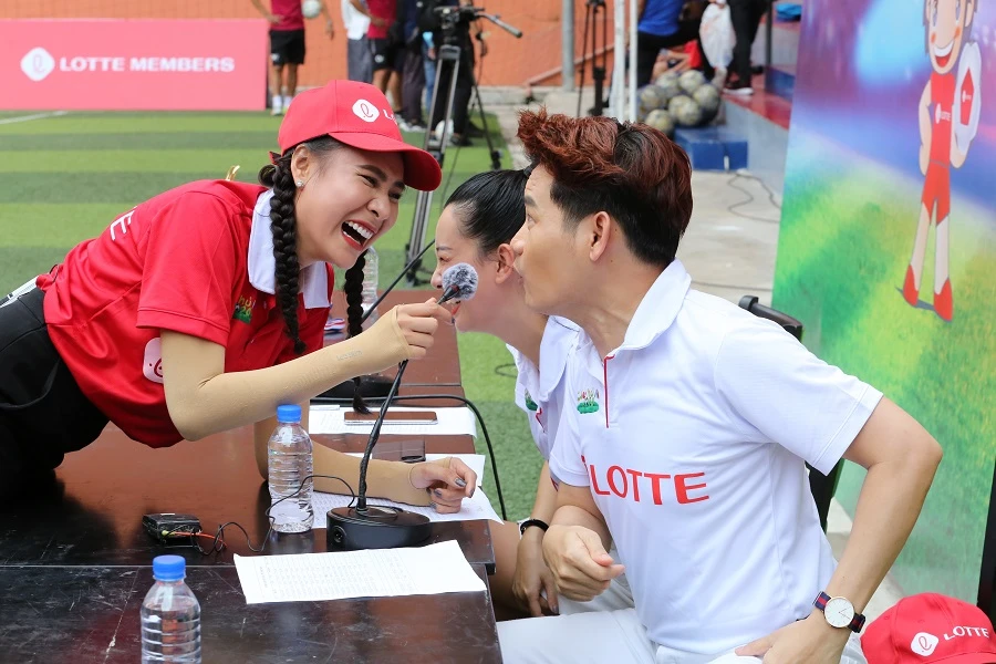 Thậm chí vì trời quá nóng, nữ diễn viên không ngần ngại, chui hẳn vào những tấm biển quáng cáo trên sân để cổ vũ các cầu thủ nhí.