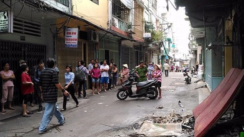 Con hẻm nơi căn nhà bị cháy, nhiều người dân vẫn tập trung bàn tán, đau xót, tiếc thương các nạn nhân.