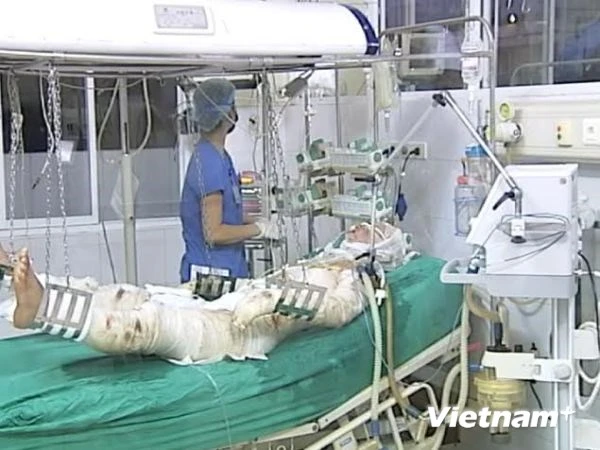 Một chiến sỹ đang điều trị tích cực tại Viện Bỏng Quốc gia. (Ảnh: PV/Vietnam+)