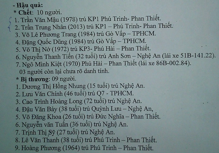 Hiện 7 trong số 10 nạn nhân đã được xác định danh tính. Trong số đó có hai tài xế Nguyễn Thanh Tiến (32 tuổi, ngụ Anh Sơn, Nghệ An) điều khiển ô tô 50 chỗ giường nằm 51B – 141.22 và Ngô Minh Kiệt (45 tuổi, ngụ phường Phú Hài) điều khiển ô tô 30 chỗ 86B – 00284.