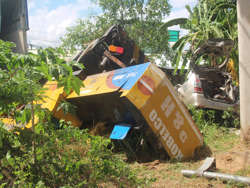 Tại hiện trường xe cẩu bị lật nhào, chiếc 7 chỗ bị chiếc xe cầu đè lên khiến phương tiện hư hỏng hoàn toàn.