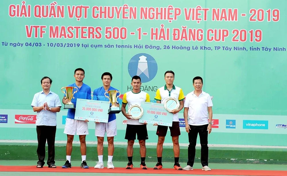 Các tay vợt tham gia trận chung kết đôi nam nhận giải thưởng. ẢNH: VTF