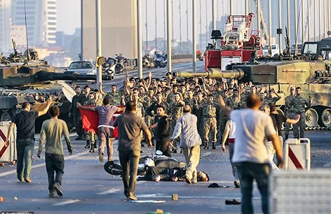 Người dân leo lên xe tăng trên cầu Bosphorus ở Istanbul sau khi quân đảo chính đầu hàng. Ảnh: ANADOLU