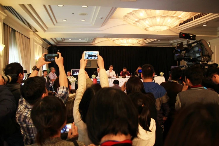 Quang cảnh buổi họp báo. Ông Vương Duy Biên, Thứ trưởng Bộ VH-TT&DL, nói rằng ông đã dự nhiều cuộc họp báo nhưng chưa có cuộc nào đông như thế.